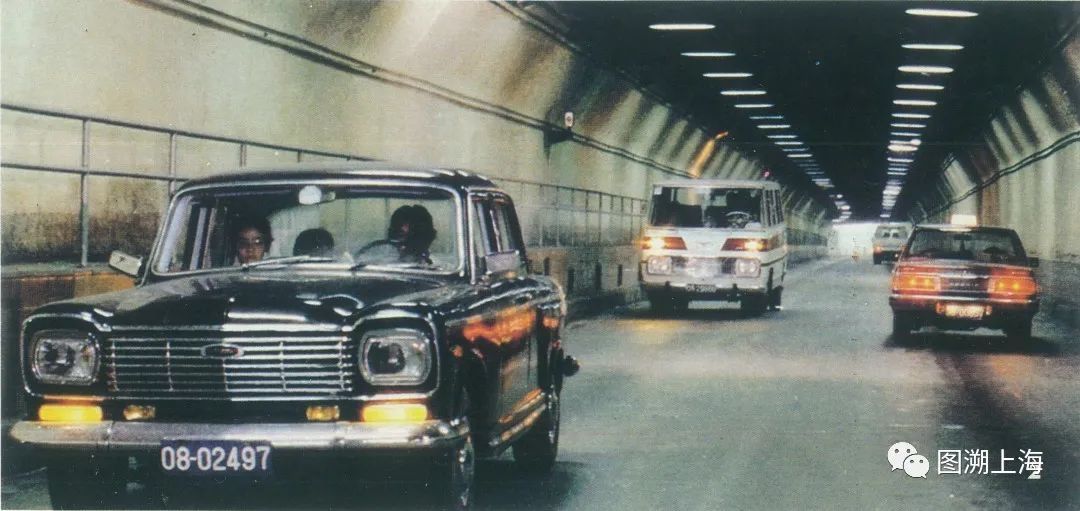 延安东路隧道试通车典礼上,隧道三线sk661f2型驶经隧道浦西出口