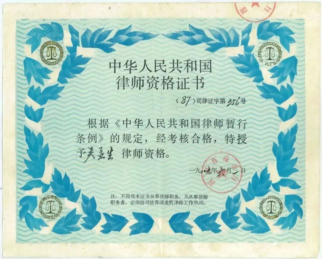 律师资格考试通过后,经考核授予的律师资格证书(现藏于中国律师博物馆)