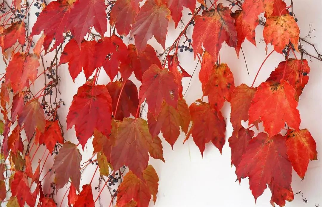 最早变色的是葡萄科的爬山虎。叶片掌状三裂或卵状心形,在最低温度15℃时开始变色,叶色可以呈现鲜红色、橙红色或黄色,这与光照程度和温差的大小以及环境中的水分有很大关系。