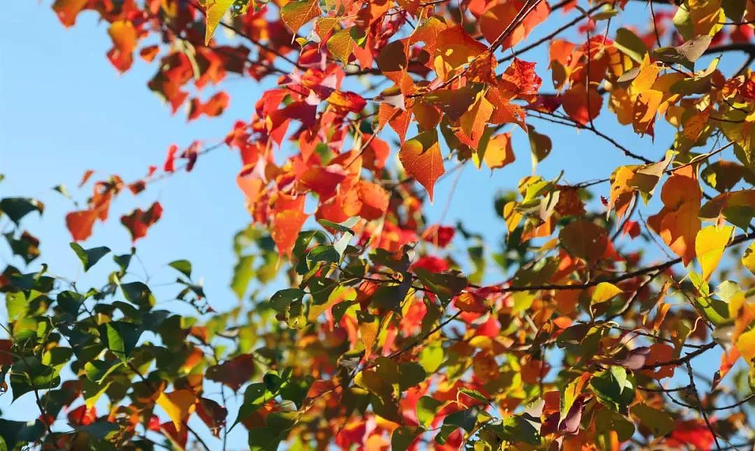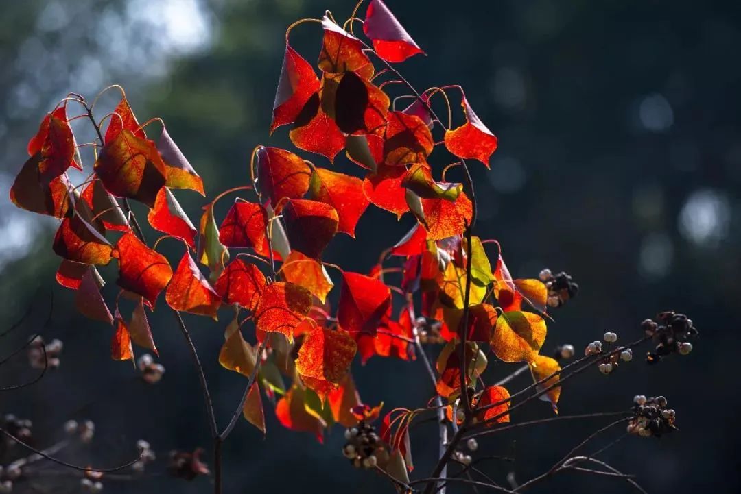 秋冬时节,乌桕在气温、昼夜温差、光照和水分等因素的综合作用下逐渐变红,叶内花青素与叶绿素的比例,使得同一株乌桕上,叶片五颜六色,红黄绿将整个大树点缀得缤纷绚烂。