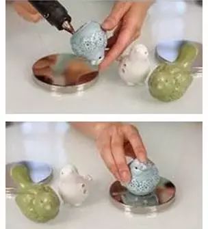 只要将自己喜欢的小饰品涂上粘黏剂,最好是热熔胶,让后粘在老干妈罐头的瓶盖上面即可。