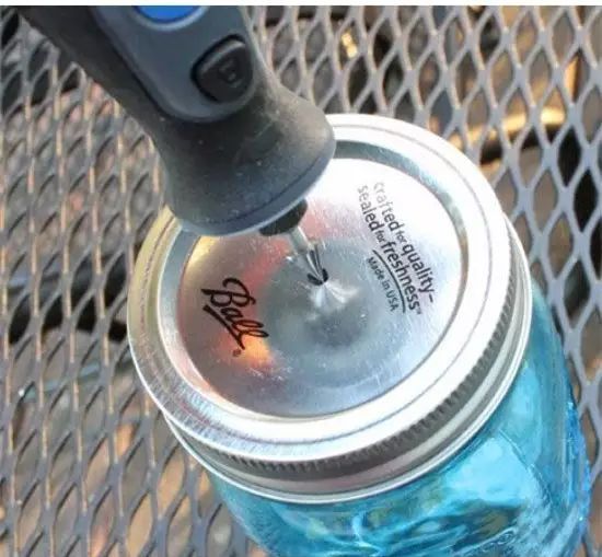 首先在罐头盖子上钻一个孔,大小应该跟放进去的挤压器管子一样大。