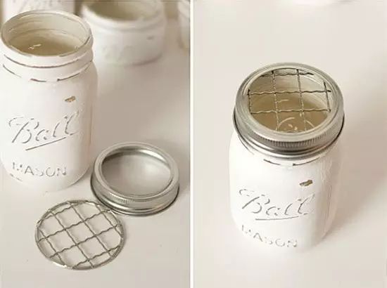 用罐头开启器,延边将铁盖的中间切下,在瓶体和盖子之间放置相应大小的铁丝网,牙刷罐、棉签储存罐、小花瓶,就做成了。如果嫌铁丝网麻烦,可以直接用胶带粘成格状。