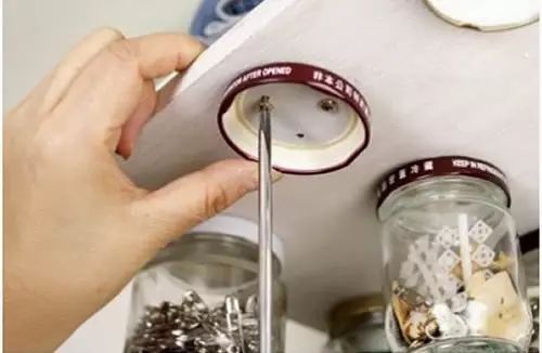 然后用螺丝将瓶盖排列好,固定到木质的储物板上面。