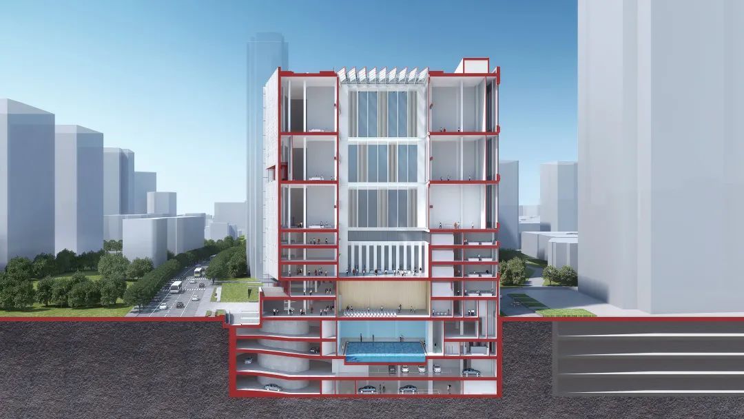 整个项目注重土地的复合利用,集体育、文化、科创等功能于一体,以“年轻、时尚、创新、活力”为主题,建成后的项目为一个地上8层、地下3层的综合建筑。