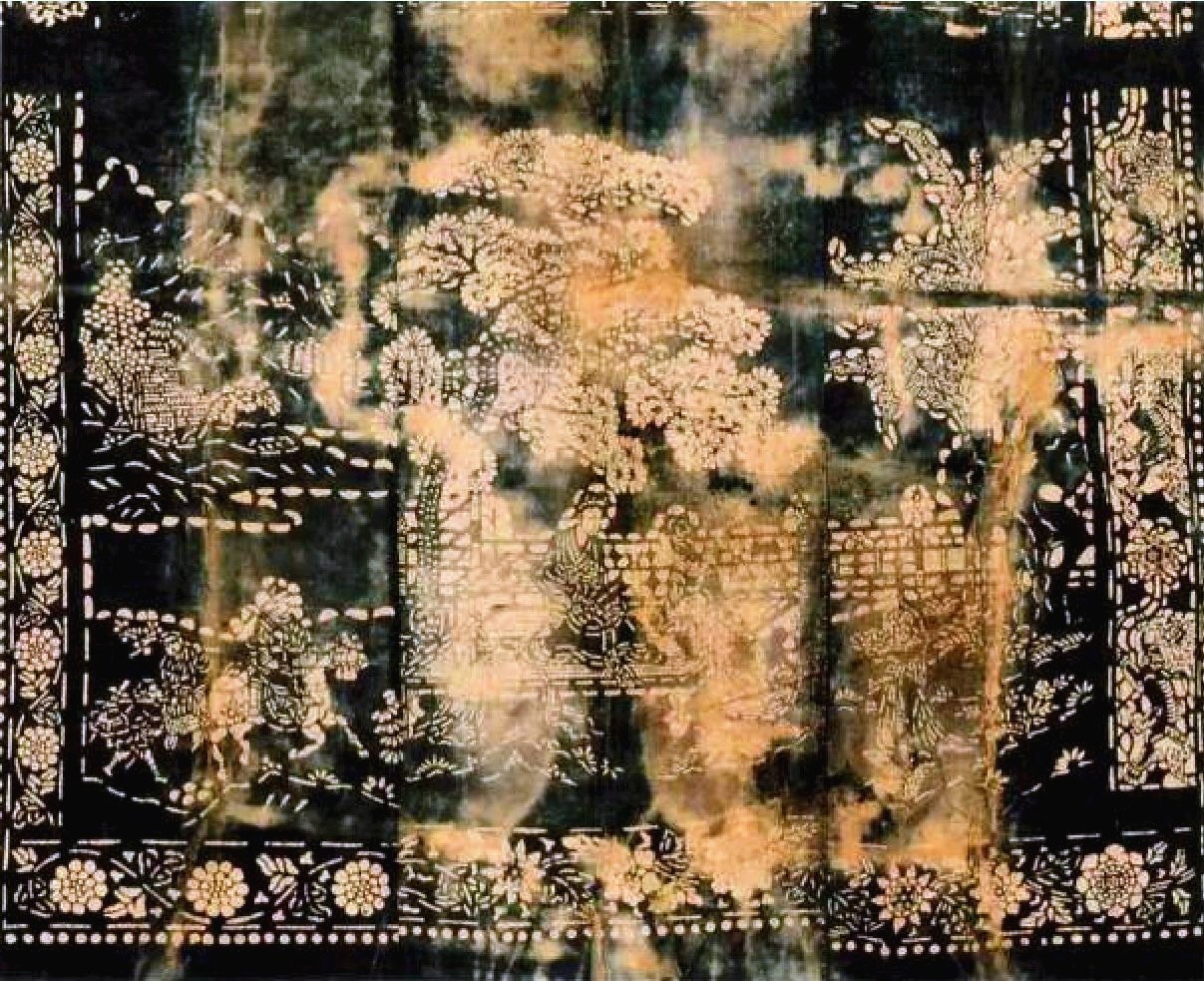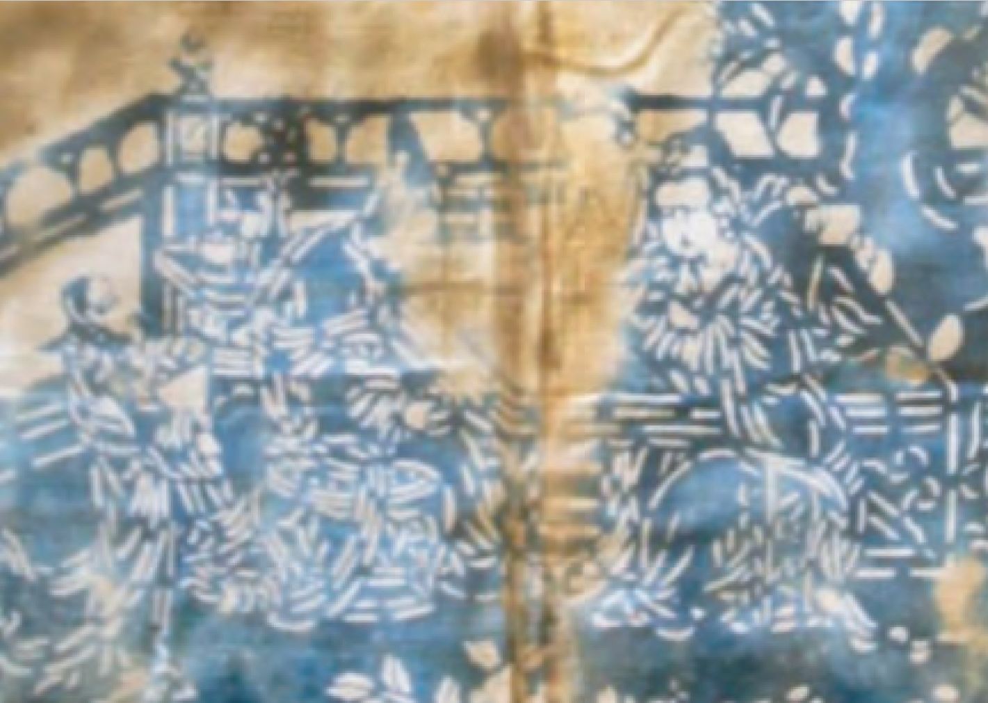 从被面整体来看,右侧图案和中心图案由背景围栏相接构图完整,衔接自然。另外两条被面侵蚀较为严重,其中一条仍能看出主体图案为两人对奕庭院,两边各立几名侍女,庭院内有假山石、牡丹花、芭蕉及杂树相映,院外远山连绵起伏,且背景远山以大面积留白表现,院内围栏曲径通幽,一派春光诗意。“山水、人物被面”点、线、面的设计依形而设,人物与景物运用不同的纹理,区分前后层次,注重立体空间表现,画面写实生动。由此可见,明代中期这里的蓝印花布制作工艺已经成熟。
