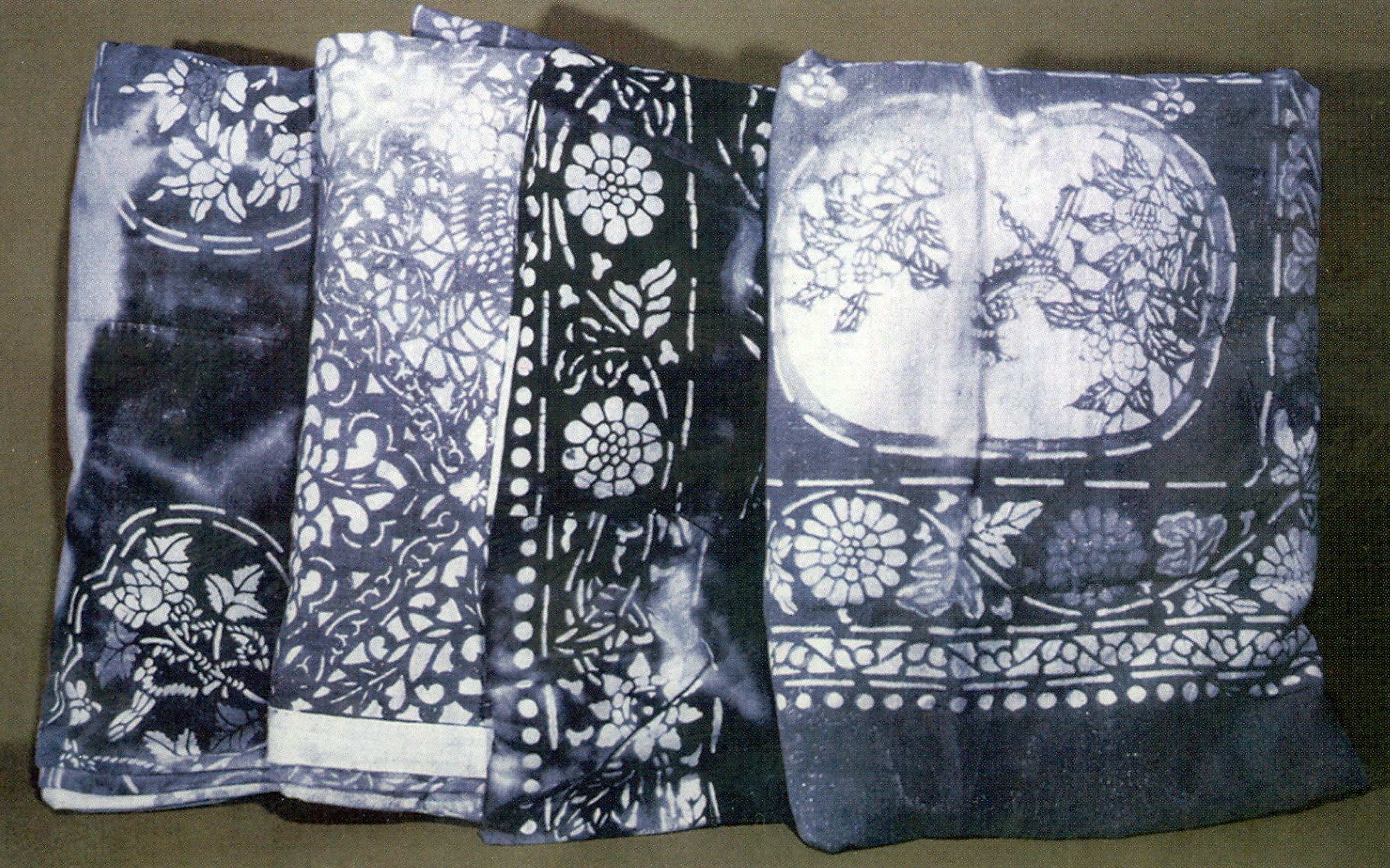 这四条被面均长2 米、宽1.7米,蓝色作底,每条被面由三条大至相等的粗棉布先印花后纵向拼接而成。据一起出土的一张地契所记时间,考证为明代末期。这四条被面的图案内容各不相同,制作工艺精湛,纹样线条流畅,造型构图饱满。其中一条被面可称“菱形满地花被面”,主题内容为四方连续式菱形骨格内装饰花草、凤鸟、狮子滚绣球等图案,上下两边被头带饰为二方连续式菊花与凤戏牡丹的卷草花边,与主体花卉、鸟兽图案内容相呼应,且菱形骨格装饰以精美的纹饰。另三条被面可称“山水、人物被面”,构图基本相似,四周布以二方连续式花卉、鸟兽图案为花边,中心分为两部分,上部是三个开光花鸟折枝图案,上下两部中间由一道带饰分割开来构成装饰边栏。下部三组由不同的山水、人物、花卉图案组合构成。其中保存较为完整的一幅被面,画面中心图案为两个贵妇在松荫下闲聊,左侧站立一个侍从,似在向主妇禀报,右侧芭蕉树下一侍从双手端盘朝主妇走来。而左侧一组图案为主仆三人的山水行旅图,一匹昂首奔马四肢矫健,马上是头戴乌纱帽的官人,策马扬鞭,身后跟着两个挑行李侍童,正沿着山道匆匆而来。