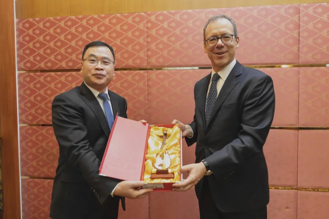 区委副书记、区长陈宇剑(左)向瑞士驻上海总领事曾礼惟(右)赠送工艺琵琶