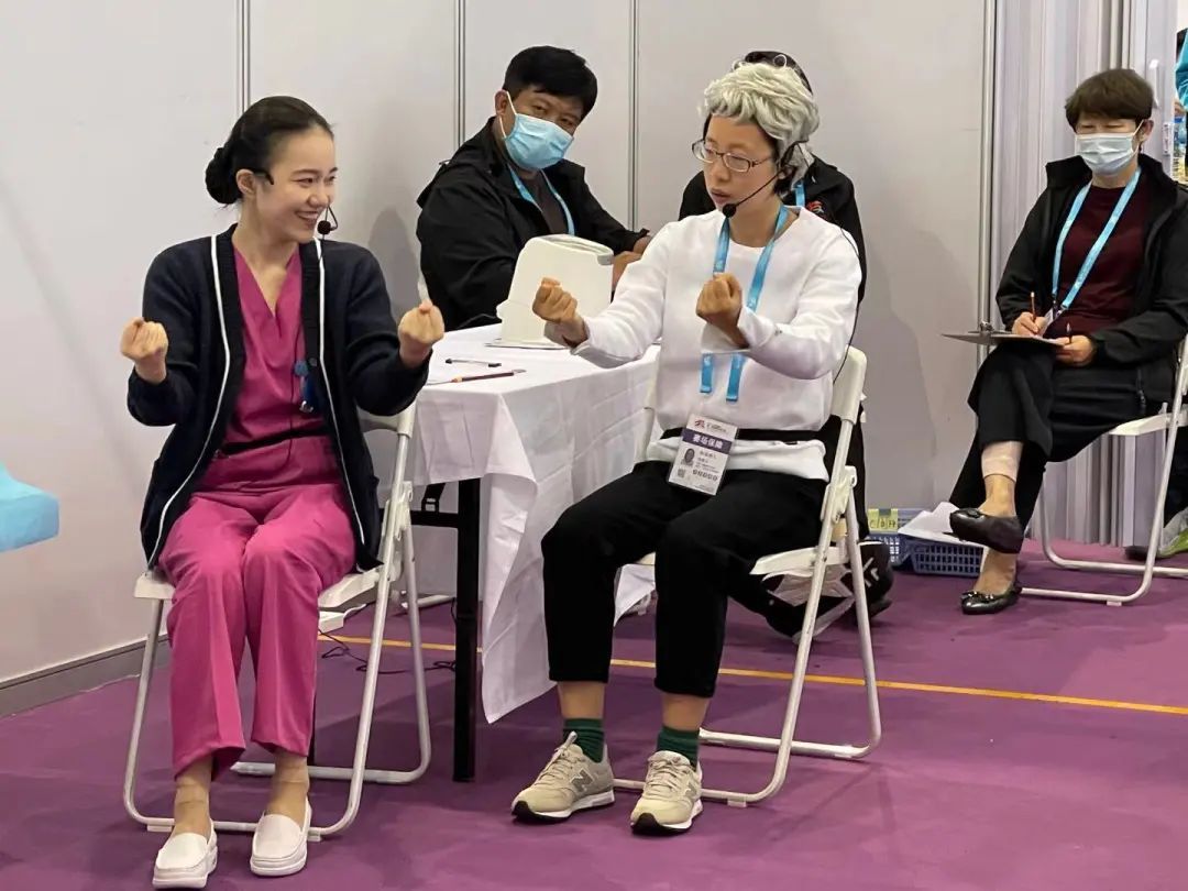 来自上海健康医学院的大四学生吴怡欣获得了健康和社会照护项目的金牌。她对此次比赛最深的印象就是“不一样”,实地和以往培训时有很多不一样,场地布局不一样、比赛道具体温计不一样、抽签方式也和原始不一样,为了应变这些“不一样”,她和教练根据最新的标准一起训练到凌晨1点,早上5点起床,9点开始比赛,只睡4个多小时。在比赛时,吴怡欣遇到与自己预想有出入的情况,仍然保持着耐心,关注“病人”的语速和表情,注重互动,最终成功突出重围,为上海代表队再添一金。