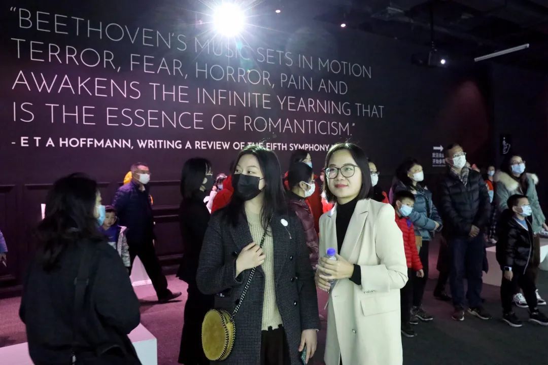 活动最后,两位艺术家带领观众一起参观了“真情无界——纪念贝多芬诞辰250周年声音交互艺术体验大展”,通过艺术家的讲解导览,现场会员在音乐厅,“遇见”这位200多年前的伟大音乐家,感受他每一个音符背后充满的爱与赤诚以及不屈的意志。