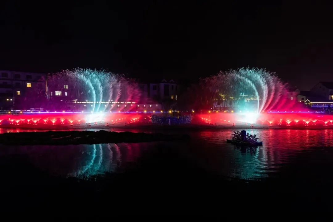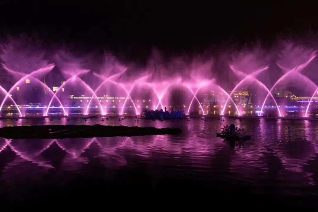 伴随着灯光、音乐、喷泉……