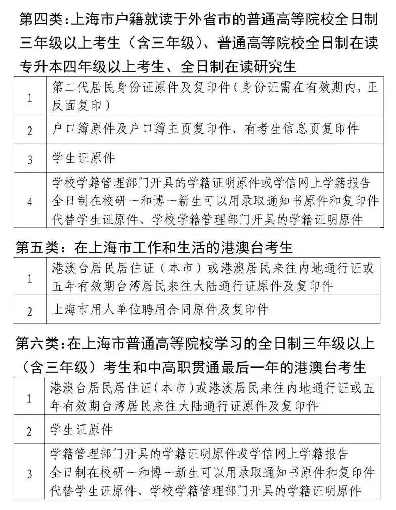 (五)上海市普通高等院校以及户籍在上海的外地普通高等院校全日制三年级以上考生(含三年级)、中高职贯通考生允许在其学习的最后一年,凭学校学籍管理部门出具的在籍学习证明报考。