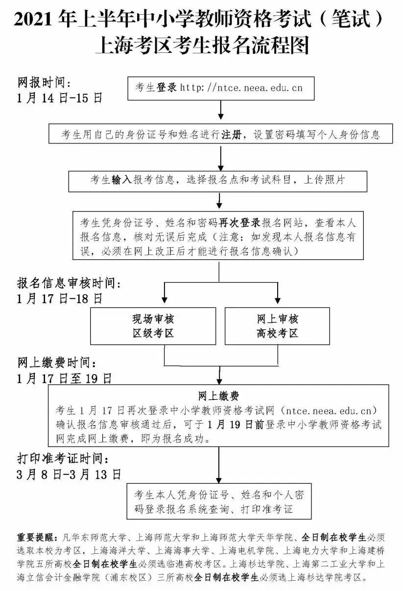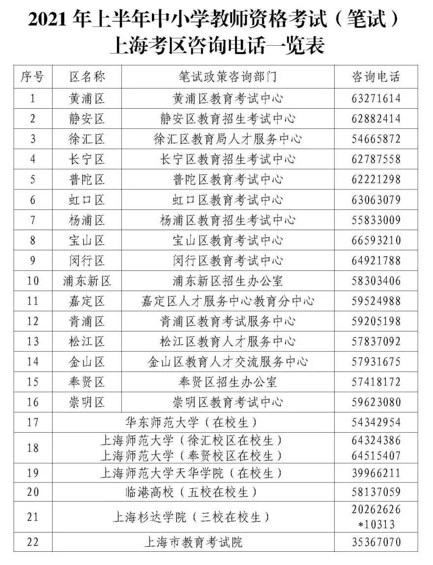 1.考生网上信息输入时间为1月14日(星期四)9:00—1月15日(星期五)24:00。报名政策咨询联系方式见2021年上半年中小学教师资格考试(笔试)上海考区咨询电话一览表(详见↓)。