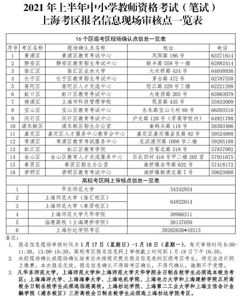 1.现场审核:已完成网上信息输入的考生(高校考区除外)须在规定时间内自行到各区指定的现场审核地点,审核地址详见2021年上半年中小学教师资格考试(笔试)上海考区报名信息现场审核点一览表(详见↓),完成报名信息确认(含身份与户籍信息、报考科目信息等)和签字提交等事宜。