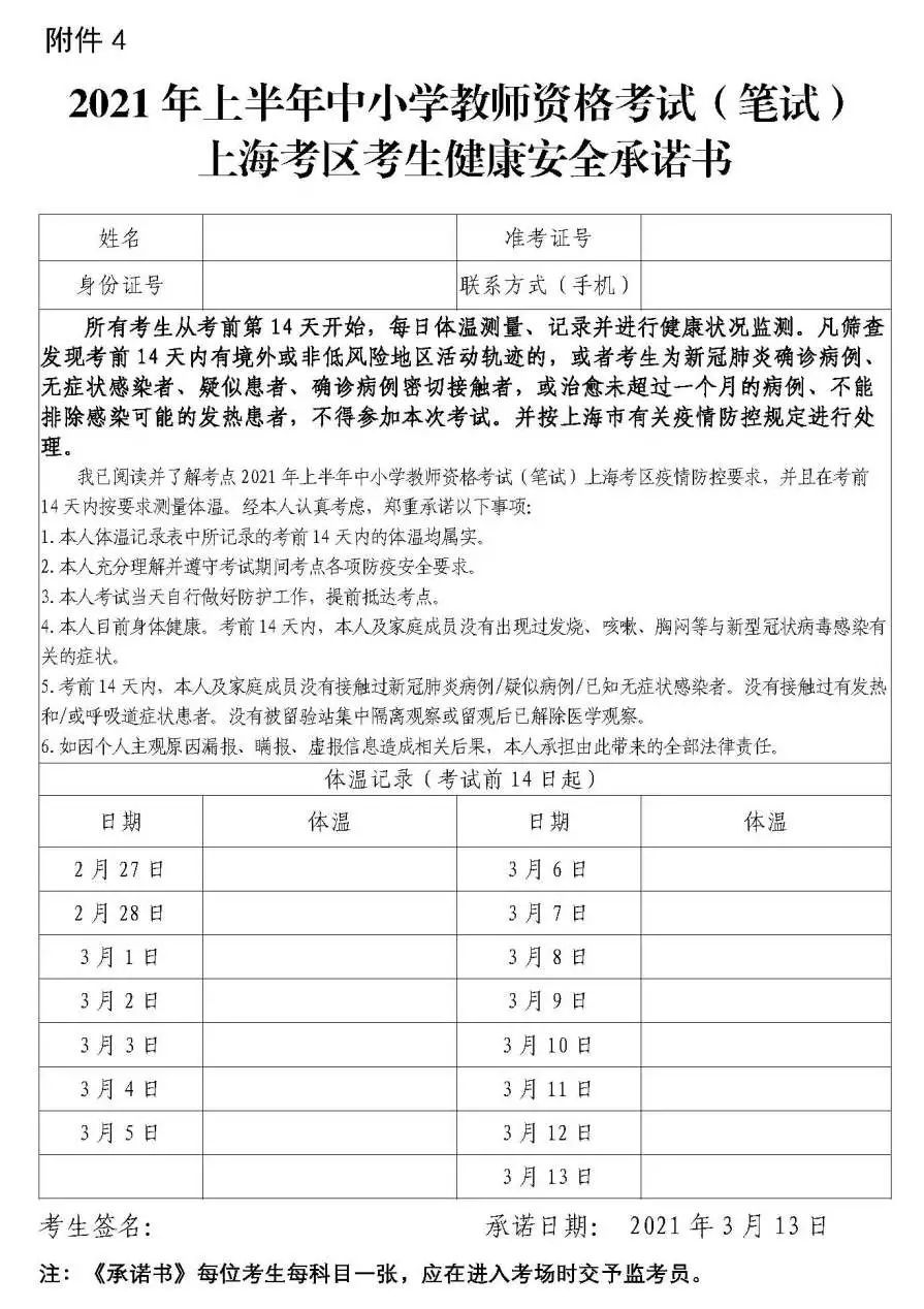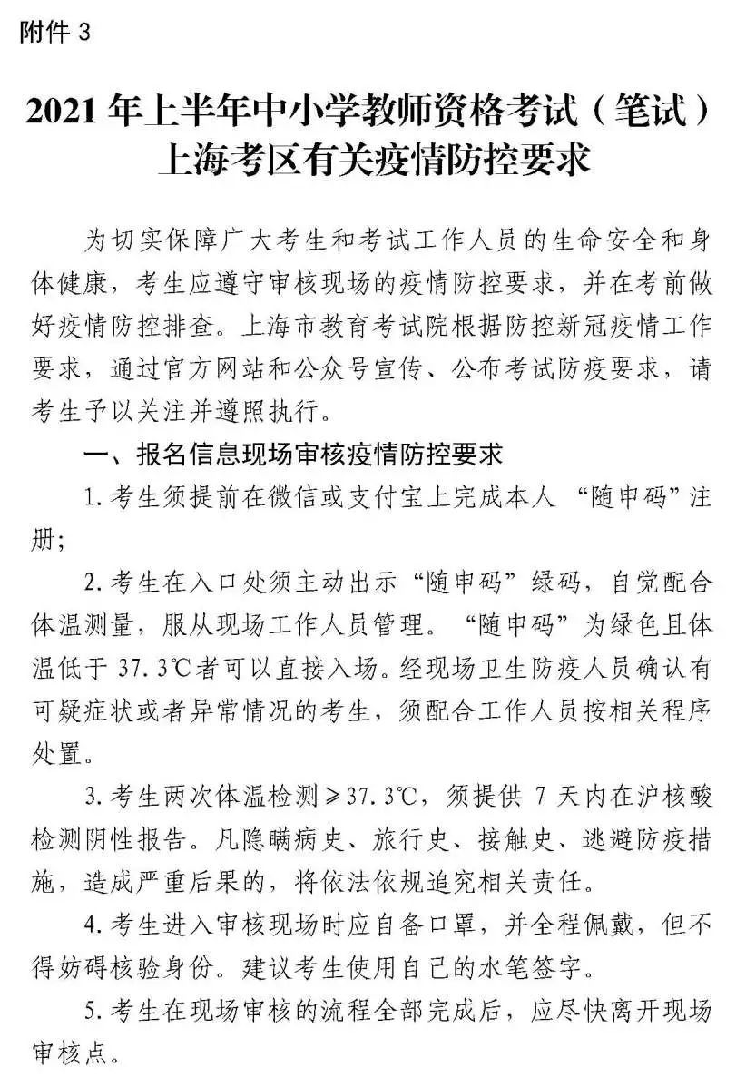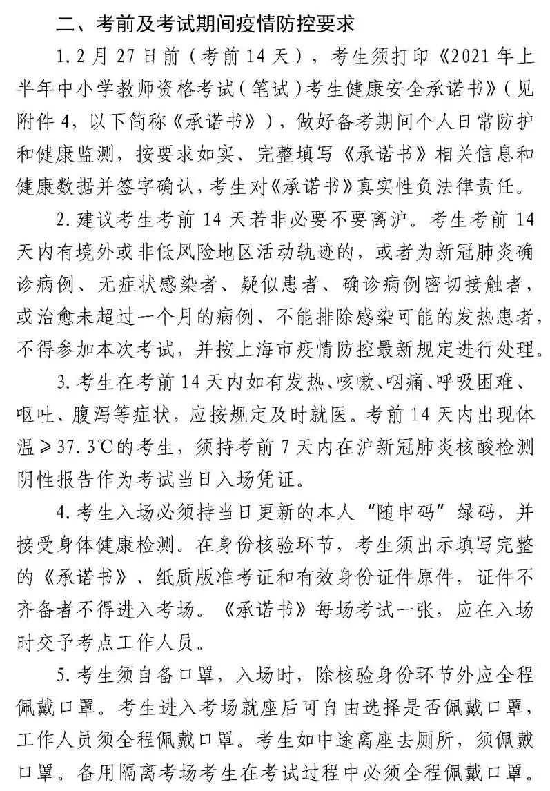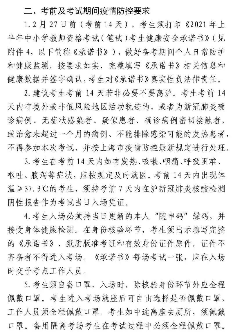 (八)考前防控疫情排查要求。请考生自觉对照2021年上半年中小学教师资格考试(笔试)上海考区有关疫情防控要求(附件3)中的考前防控疫情排查要求进行自我排查,并填写2021年上半年中小学教师资格考试(笔试)上海考区考生健康安全承诺书(附件4)。不具备考试条件的考生不得参加本次考试。