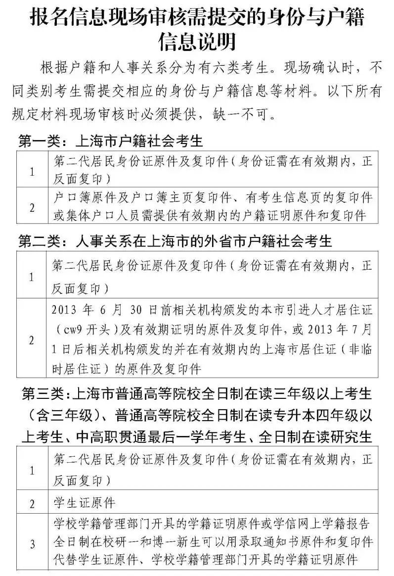 报名信息审核分为现场审核和网上审核两种方式。各区级考区实行现场审核报名信息的方式;华东师范大学、上海师范大学、上海师范大学天华学院、上海杉达学院考区、临港高校考区实行网上审核报名信息的方式。