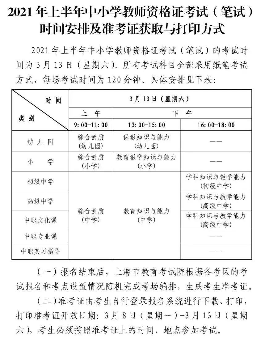根据教育部和教育部考试中心统一部署及上海市教育委员会有关文件精神,2021年上半年中小学教师资格考试(笔试)将于3月13日(星期六)举行。