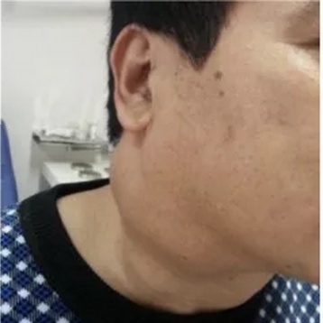 脖子一边大一边小,突出来的肿块无疼痛,质地较硬,活动度差,逐渐迅速增大并且固定。多个肿块可以互相融合成巨大的肿块。