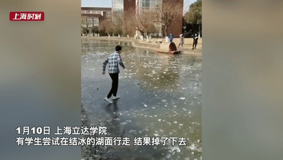1月10日,一学生在结冰湖面行走时