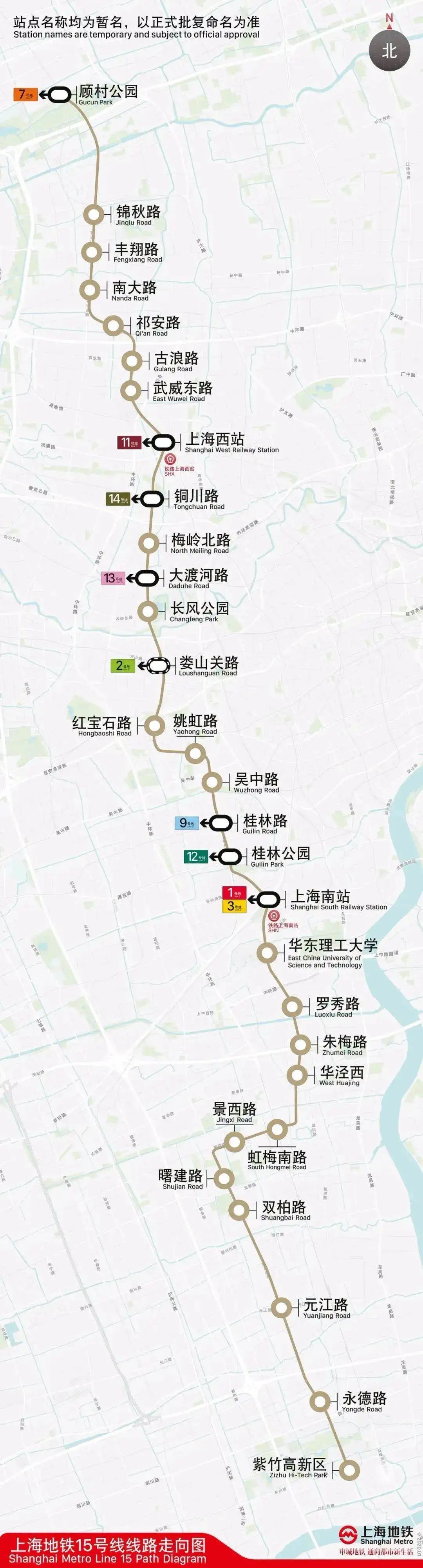 15号线是一条南北向的线路,全长约42.3公里,设立了30座车站。从顾村公园站出发,途径宝山、普陀、长宁、徐汇、闵行5个区。