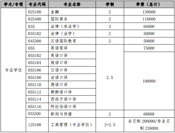 专业学位硕士各专业学制(年),学费(人民币元)情况请见下表: