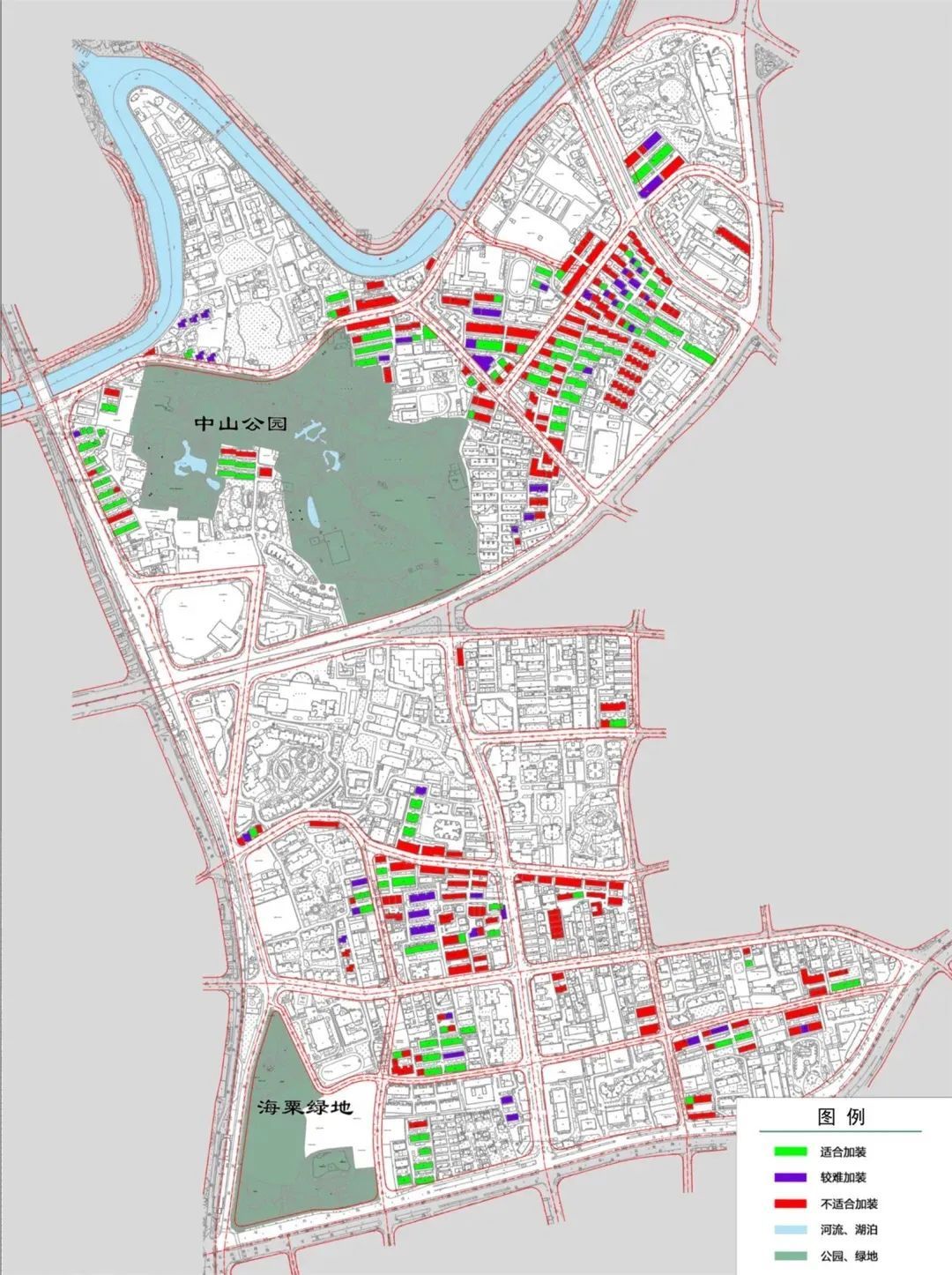 根据实地调查,设计院为每个小区都出具了一本《既有多层住宅加装电梯前期调查与可行性评估咨询报告》,每一本《报告》皆清楚对小区评估结果总平面图、调查评估目的、内容及范围、调查与评估依据,同时对于楼幢建筑年代、地上层数、地下层数、结构体系、楼梯类型、规划红线、防火间距等30余项相关信息进行标注,最后在综合考虑规划红线、周边道路和绿化、临近建筑等各类干扰因素后将楼幢建筑分为适合加梯、较难加梯以及不适合加梯三类。