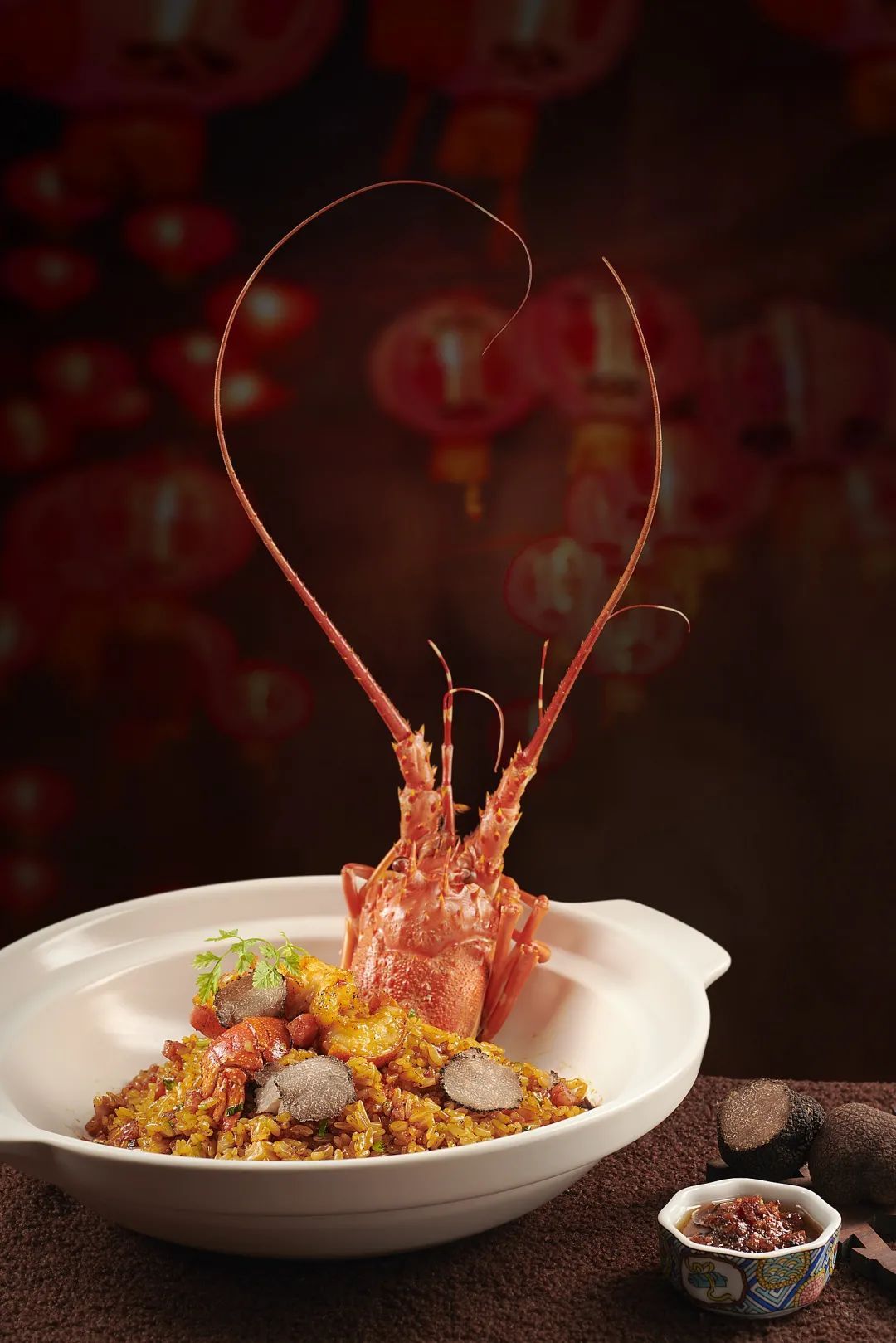 冬天好吃腊味,鲜活的龙虾与之同烧,可以让龙虾的鲜味和腊味的浓郁合二为一。再与糯米饭同炒,让每颗糯米保持q弹之余,更赋予它冬天的北风气息。添上新鲜的时令黑松露,馥郁的香味令整道菜品有了质的提升。鲜亮的色彩加上油润的光泽,寓意着家运兴旺福祉到,胜意盈门龙呈祥!