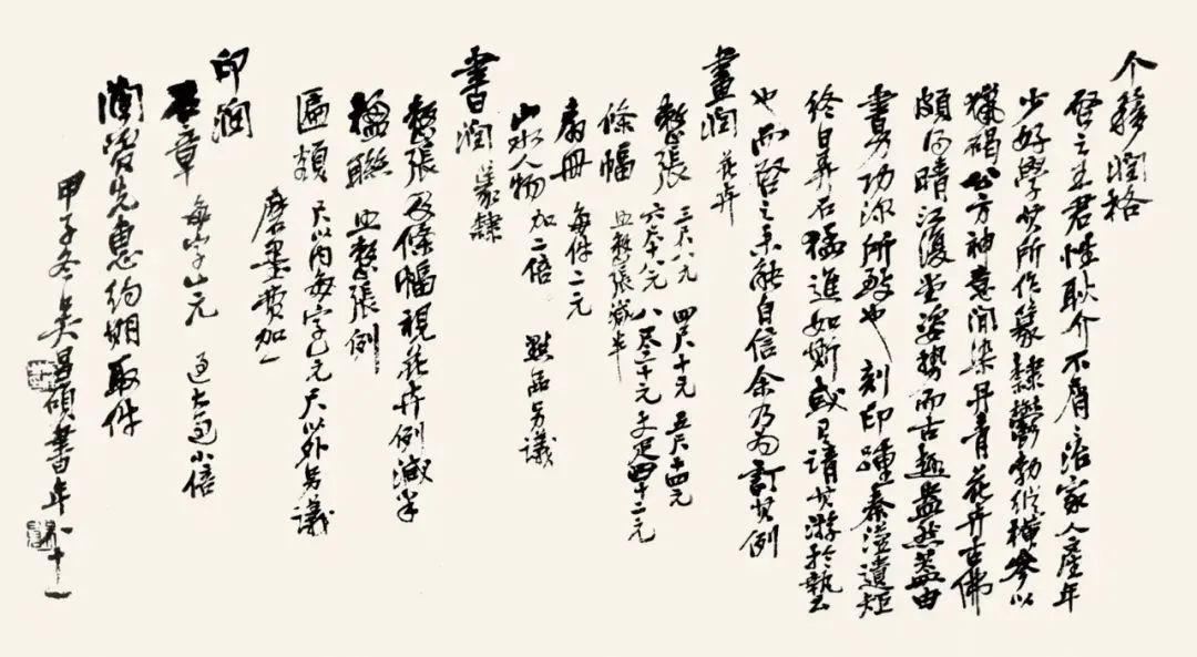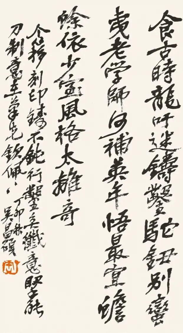其绘画,融吴派艺术精髓,复以造化为师,深入生活,风格别具。晚年纵横挥写,突破吴门格局,使海派艺术更上层楼。其书法,师石鼓籀笔,遒劲雄健,富金石气,在不经意间,出神入化。篆刻乃直追秦汉,方寸之间,神雄气韵,无不称意。诗似乐府民歌,有香山之风。又擅长古琴,颇饶韵味。