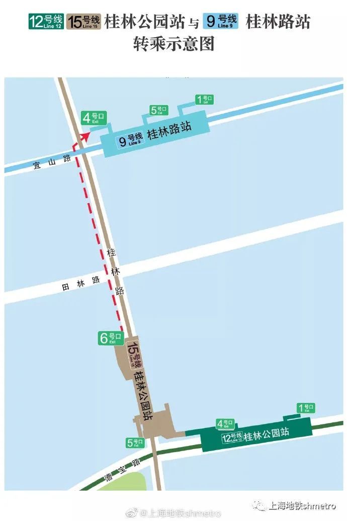 此次初期运营的15号线,桂林路站暂不开通。有小伙伴问了,要换乘9号线桂林路站怎么走呢?