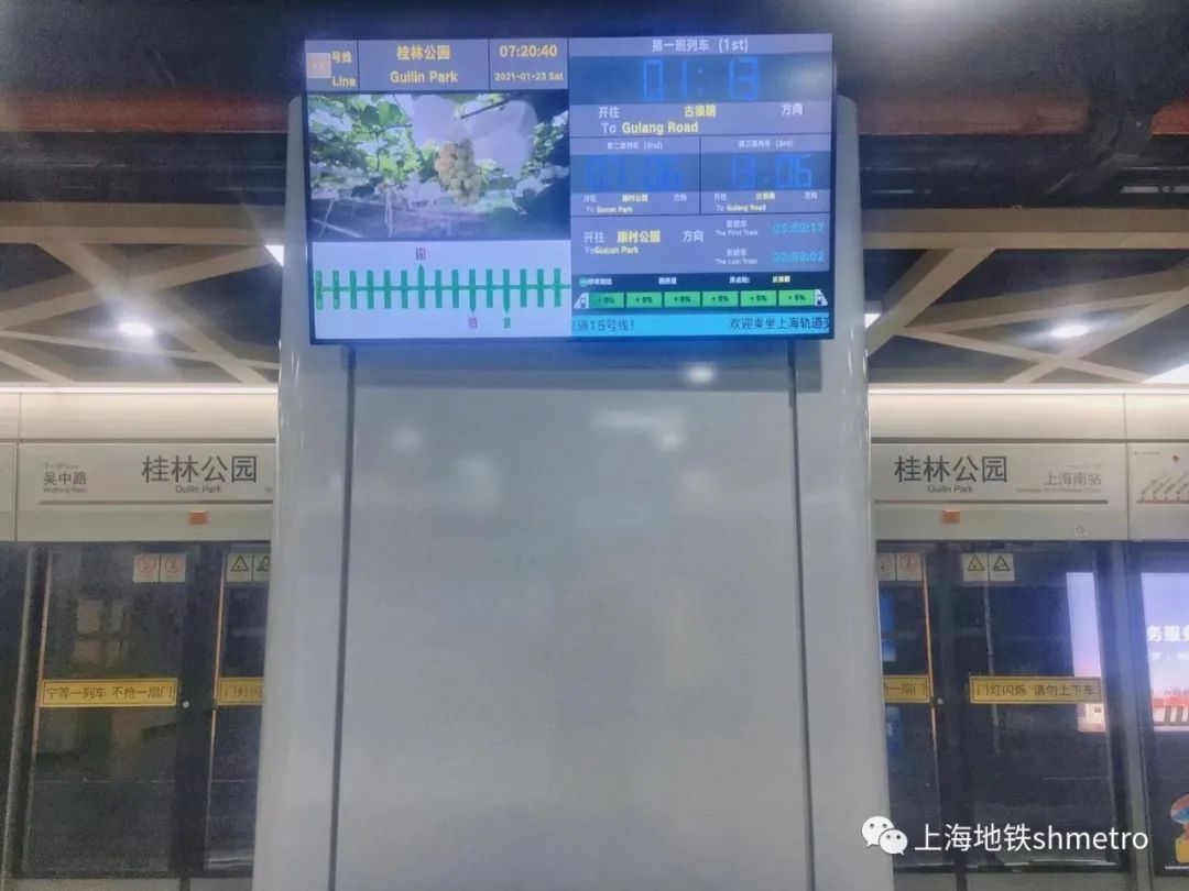 在桂林公园站,通过换乘通道,可以很方便的进行12号线与15号线的换乘。在15号线站台,乘客显示屏安装在立柱上,一下自动扶梯就能看到,很方便。