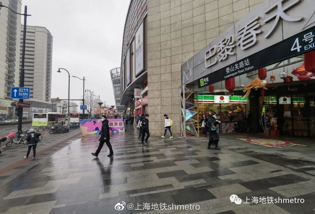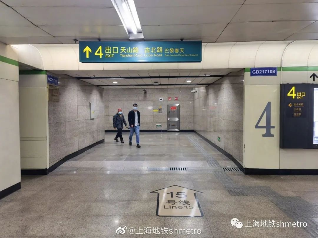 出站后,沿着天山路向西步行至天山路古北路路口,右转进入古北路,继续根据地面导向提示步行。