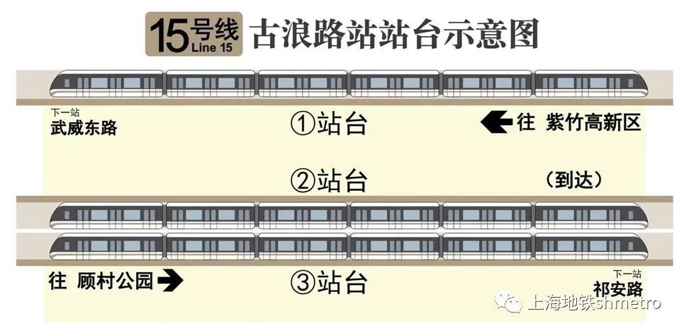 15号线小交路终点站为古浪路站,该站为“一岛一侧”混合式站台(详见下图)。在该站换乘大交路往顾村公园方向列车的乘客,须下车后,通过上一层站厅到达对面站台再进行换乘,请乘客根据现场导向指引通行。