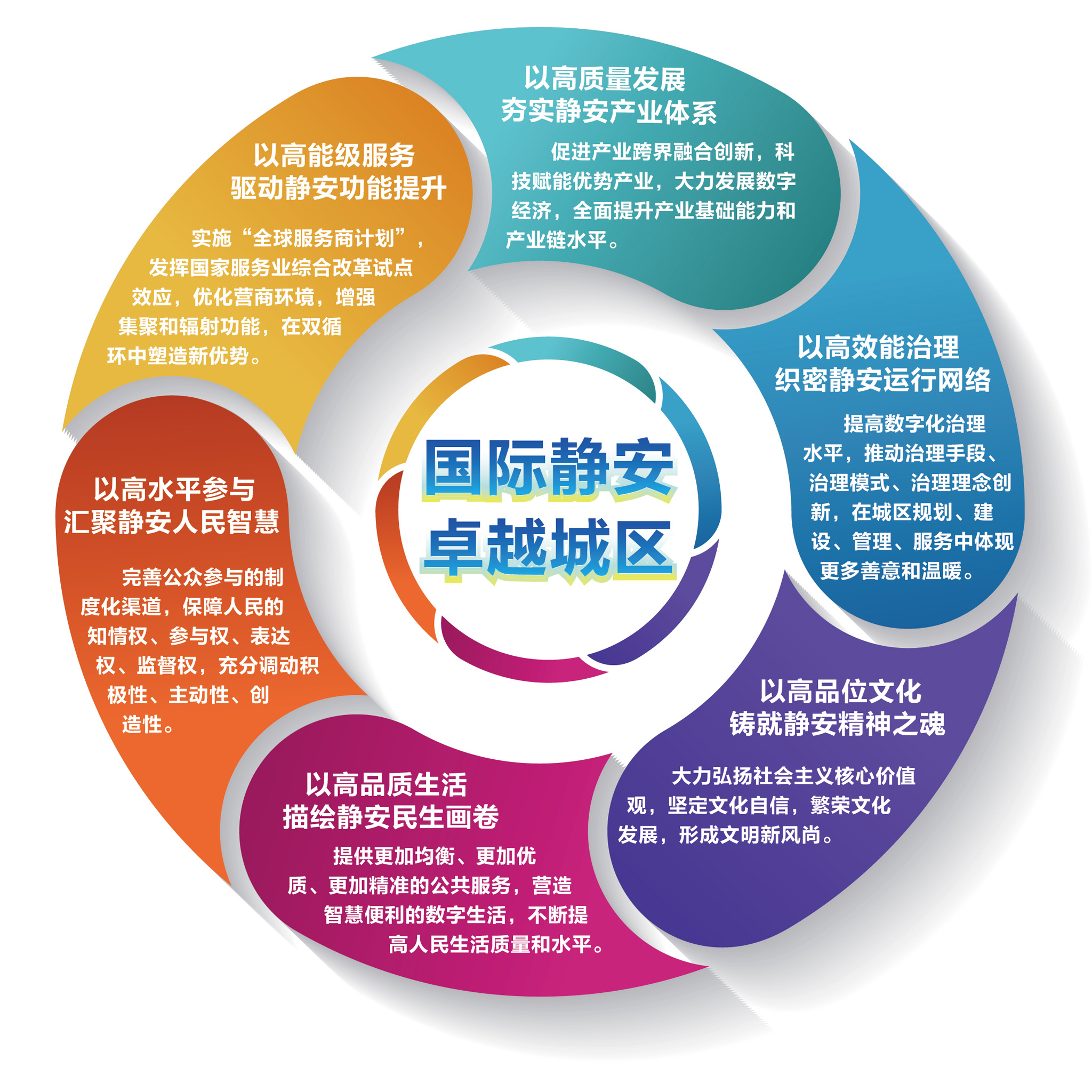 “十四五”时期发展目标:锚定二〇三五年远景目标,加快建设全球服务承载区、创新创业活力区、现代治理标杆区、国际文化大都市核心区和美好生活实践区,到2025年,城区能级和核心竞争力持续提升,全面建设服务功能更加完善、综合实力更加雄厚、城区治理更加高效、文化魅力更加彰显、群众生活更加美好的“国际静安、卓越城区”,率先实现高能级服务、高质量发展、高效能治理、高品位文化、高品质生活和高水平参与,基本建成卓越的现代化国际城区。