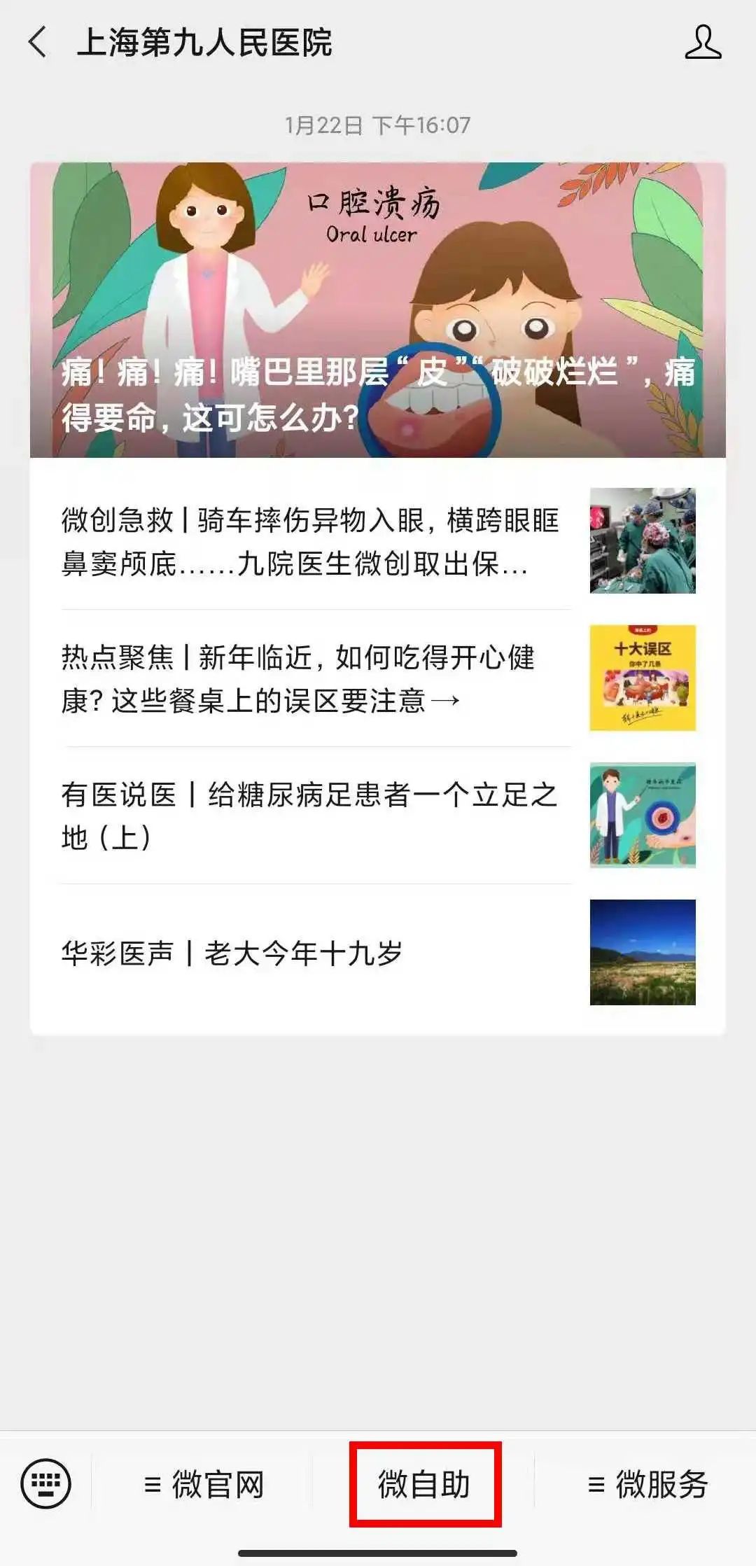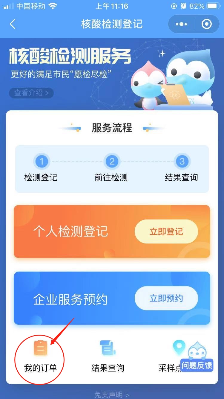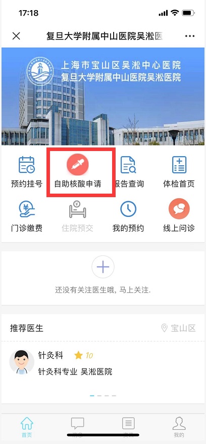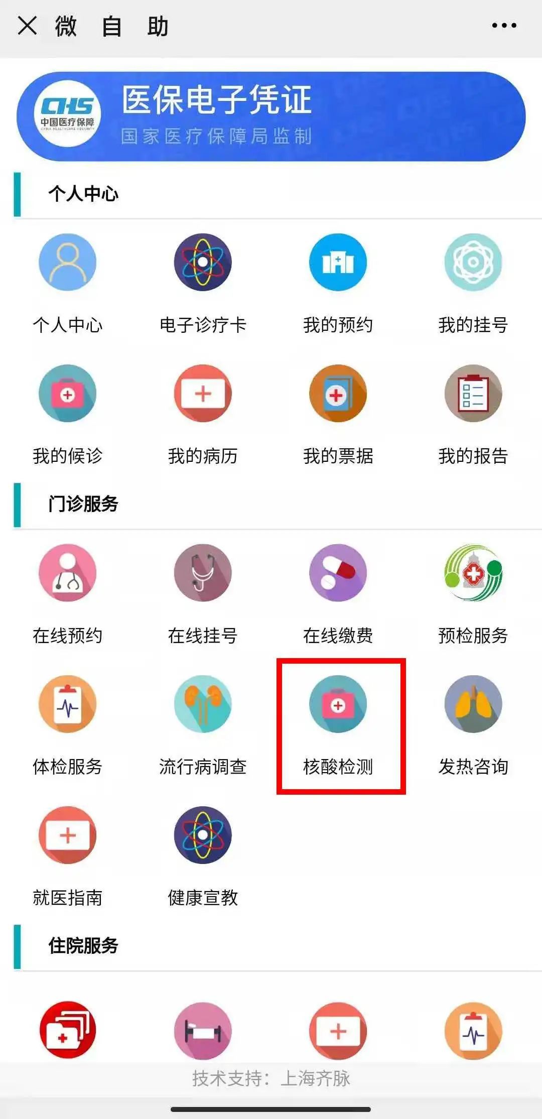 进入公众号,点击菜单栏“微自助”,点击“核酸检测”。