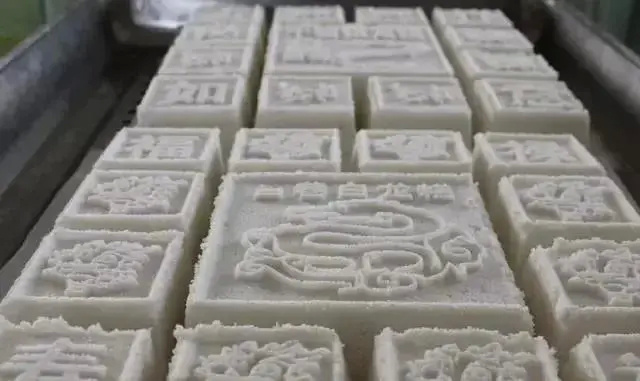 金山、松江等地的焋糕多用三乘三、四乘四、五乘五的方方正正的竹制模具,方言称之为“糕正”。之后挖洞,在糯米粉中放入豆沙或枣泥等甜馅料,再用糕粉填平模具。翻面后,揭开上面盖着的模板,糕点就有了精致的外形。最后一步是将焋糕送上灶头,蒸过后的糕点可以在寒冬腊月放上个把礼拜不坏。上海市非遗吕巷白龙糕就是焋糕的典型代表。
