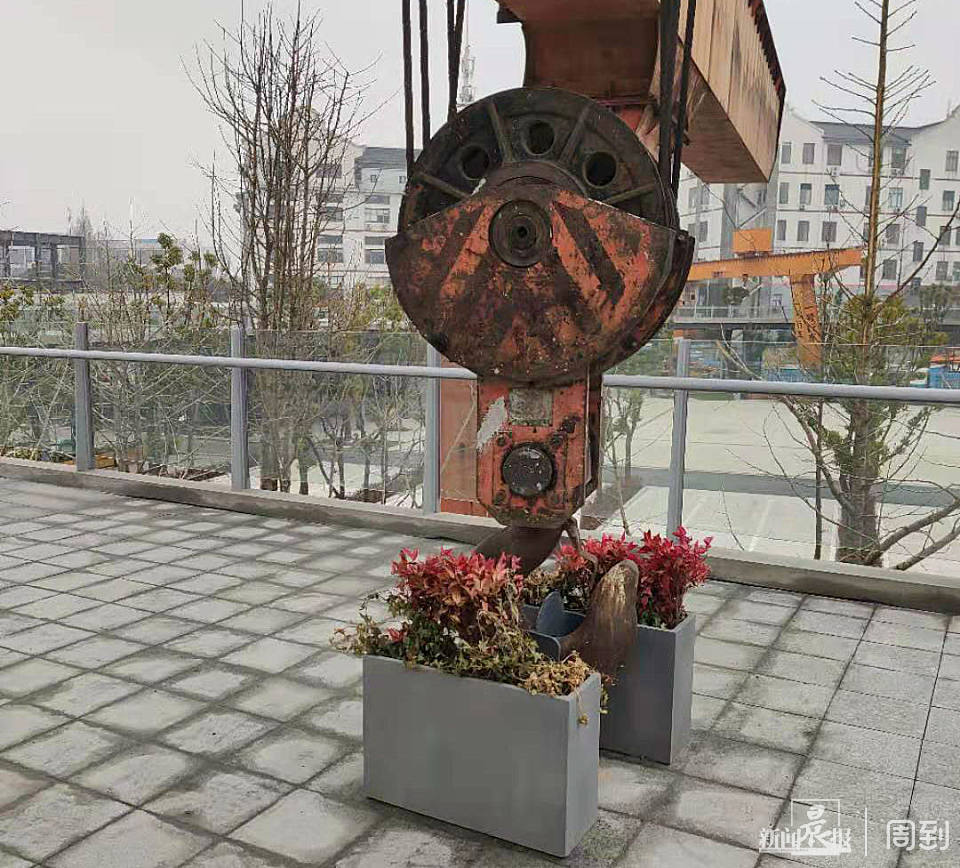 有一些塔吊的钩子垂在花盆之间,巧妙组成了别具趣味的景观。