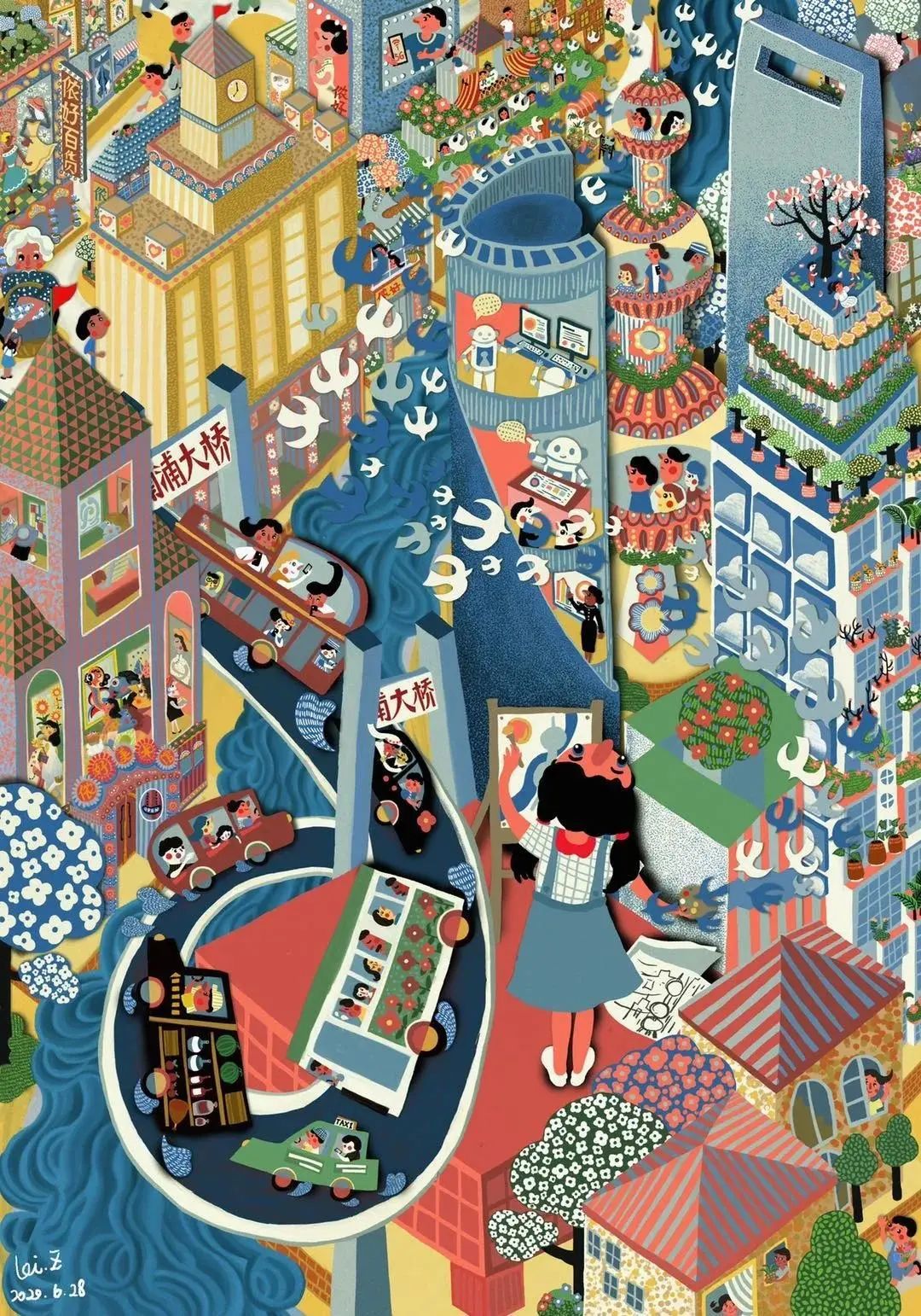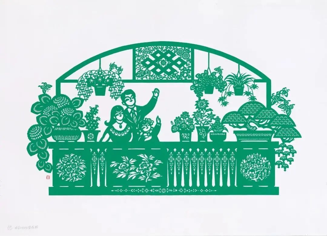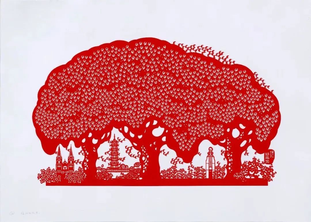 孙平先生的剪纸一贯有自己的特色,也有其每个阶段风格迥异的创意呈现。从其儿童题材作品的质朴可爱,活泼生动,到祖国大好河山的精心描绘,及对上海城市精神的刻画,其作品有着南方剪纸特有的清美秀丽,构图饱满工整,颇有大气之风,观其细节处,线条细腻精致,色彩艳丽,具有丰富的装饰性美感,有着自己独特的剪纸语言。