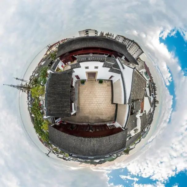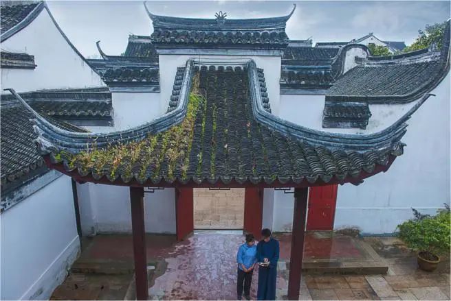 在第三进,我们可以看到建筑屋脊两端有耸起指向天穹的翘角,这种弯檐翘角的建筑格局,为江南文化显著特点,代表本土的吴越气韵。