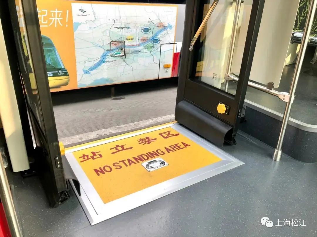 为方便乘客上下车,并考虑到特殊乘客的出行,新车型为低地板式,乘客上下车不用再迈两级台阶,一步即可走入车厢。车门设置一级无障碍踏板,踏板可展开,一头触地,配合司机开关气囊使车辆倾斜,轮椅和推车便可无障碍上下车。