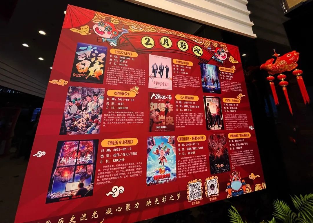 今年春节档备受期待,共有 7 部电影将展开激烈角逐,国泰电影院也利用阵地优势在外立面换上了最新的春节档电影官方海报。在进门处有序的放置了类型不同的贺岁档电影海报,大堂张贴了2月份贺岁档电影影讯,观众可以通过影讯了解到影院第一手的春节影片放映讯息。