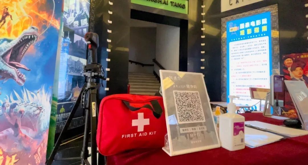 影院入口处配备了免手洗消毒液(引导观众做好“手卫生”)、医用救急包(提供医疗应急帮助)。此外,针对不会使用智能手机的老年群体,影院还增设了一名志愿服务人员提供现场指导,灵活采取身份证实名登记措施,确保老年群体安全、安心观影。