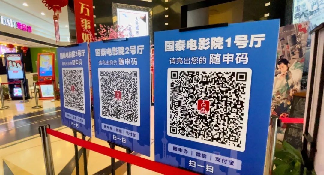 ▲影院进门处分别放置了随申码和影院观影指南