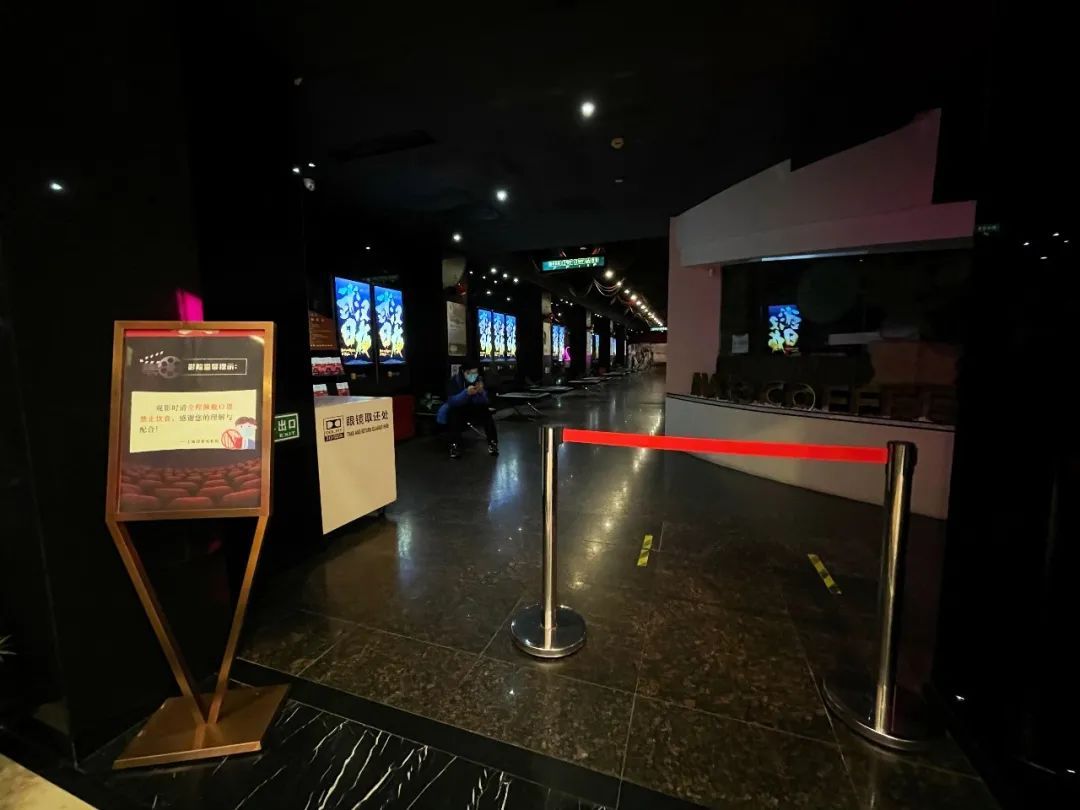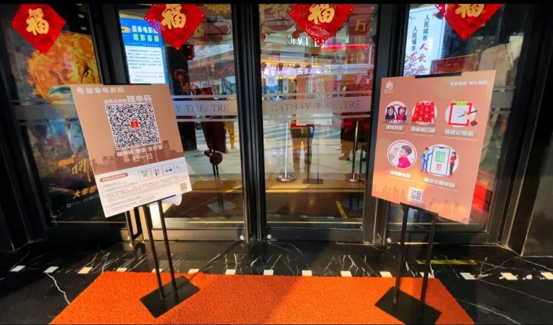 影院入口处分别放置了随申码和影院观影指南。进入影院后测温岗则是影院防疫工作至关重要的第一道防线。每位入场观众进入影院前都需要完成三部曲:出示健康码、进行测温检测、佩戴口罩。