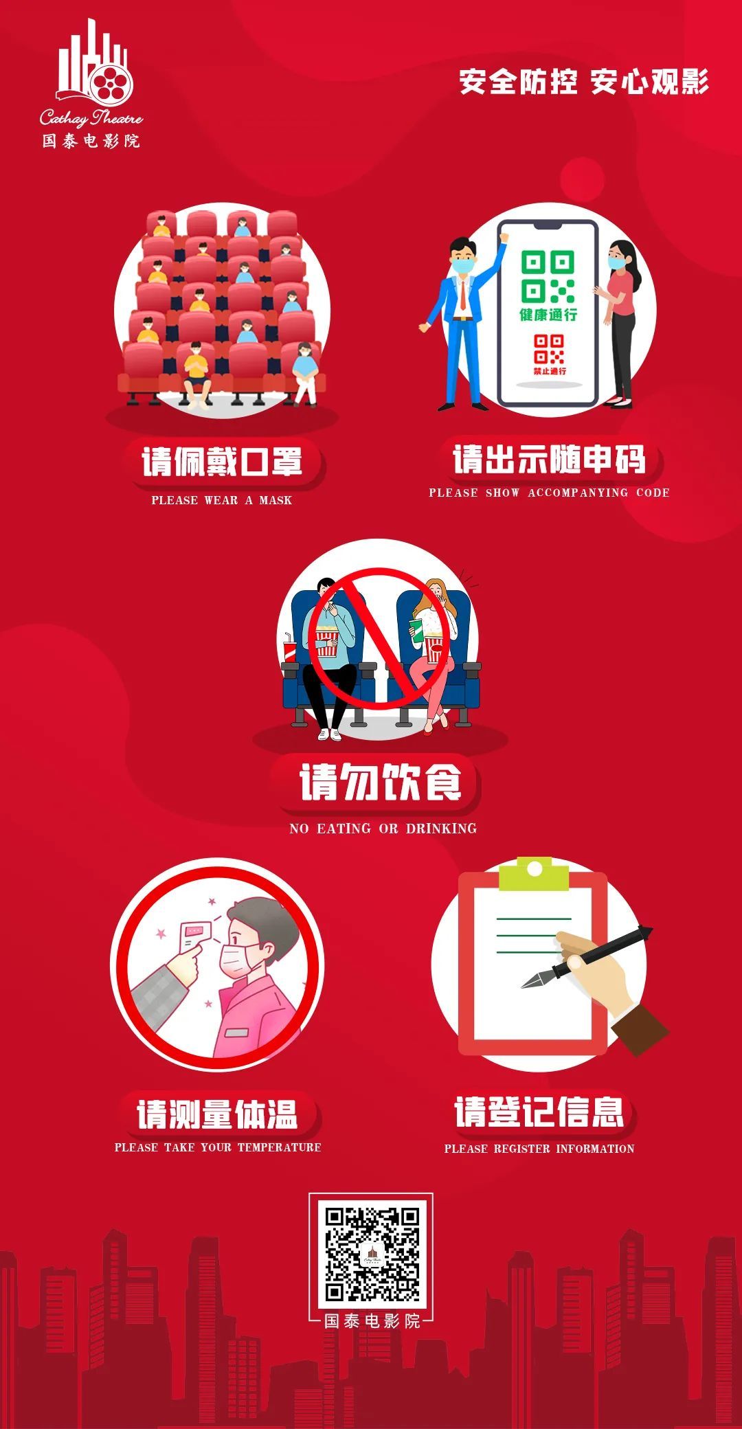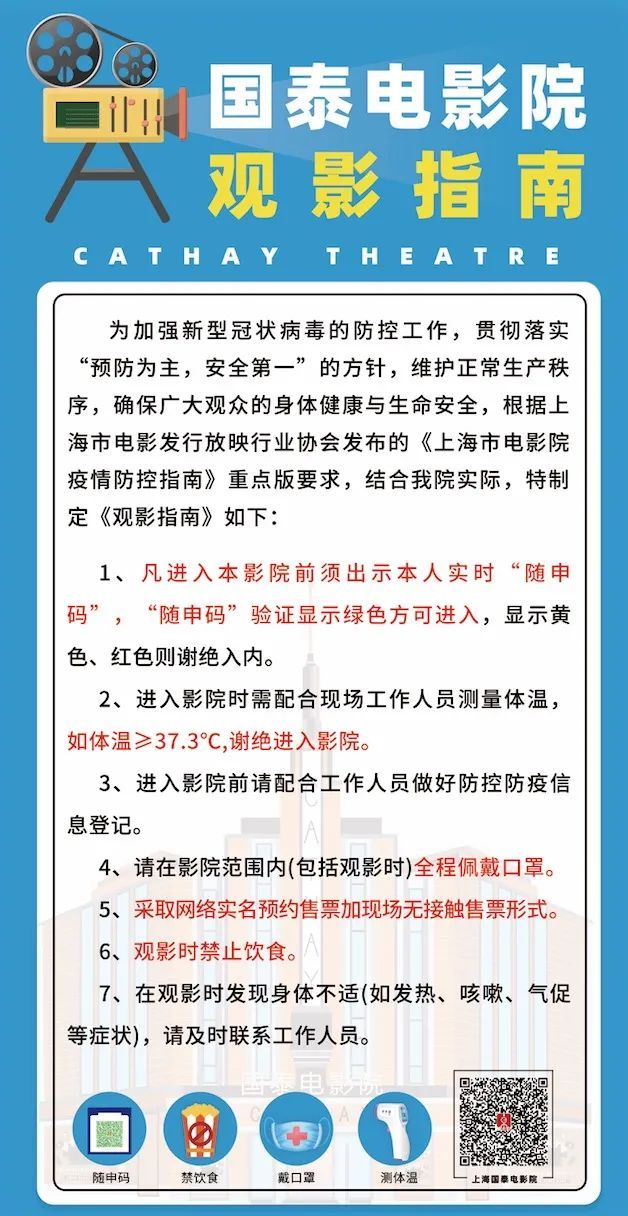 1月6日,上海市电影发行放映行业协会发布的《上海市电影疫情防控指》(重点版)要求,其中提出:要毫不松懈地做好电影院疫情防控工作,同时要求各单位要严格执行《电影放映场所恢复开放疫情防控指南》。今年,在春节期间倡导就地过年的倡议下,考虑到因疫情防控需要,就地过年群众增加的新情况,国泰电影院会落实好春节期间疫情防控措施,国泰电影院根据指南要求,结合我院实际也特别制定了《观影指南》,为观众春节观影保驾护航。
