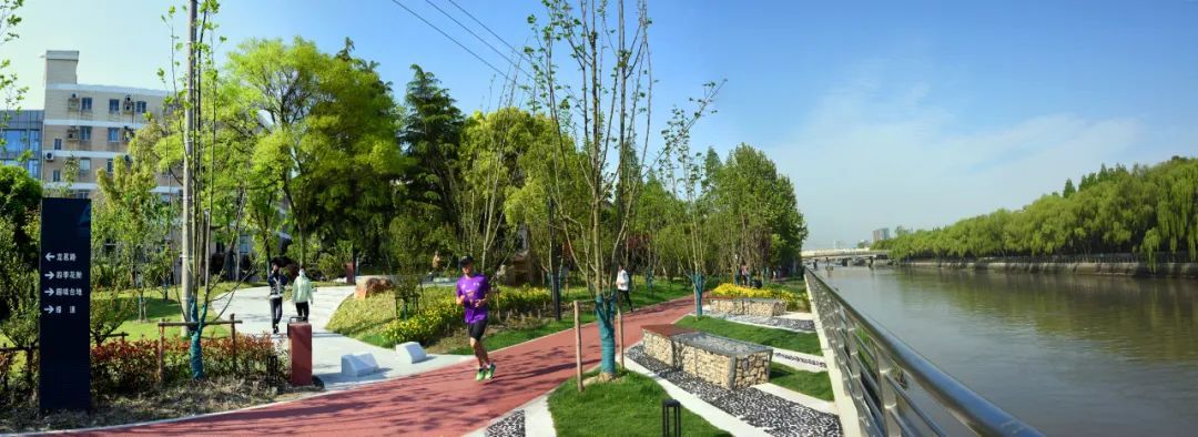 尊重原有绿地现状,完善服务功能。区内绿道建设多利用原有城市道路绿地或滨水绿地空间进行景观改造和功能提升,在保持绿地空间原有生态格局的基础上增设或改建园路,对沿途道路两侧进行绿化改造、基础设施配套、休闲空间和设施打造等,有效控制成本。如增加小型入口节点广场和林下休闲广场,局部设置花架、小品座椅、垃圾箱等公共设施,梳理现有植物,提升绿化景观,丰富植物群落。