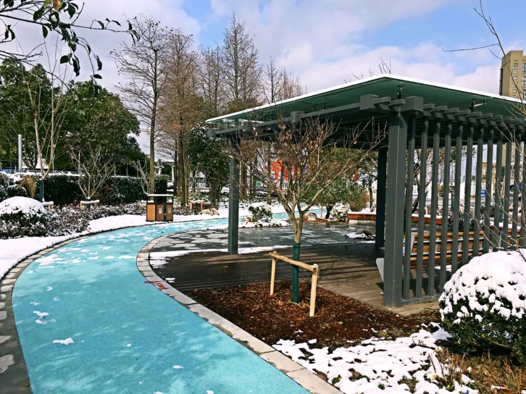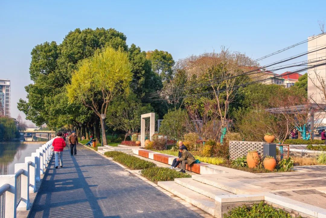 横沥港绿道:建于2017年,位于莘庄镇,北起疏影路,南至闵城路,与闵行1号绿道衔接,是贯穿闵行南北的重要生态廊道。除了优美的滨河景观和丰富的绿化植被,还将信息化技术运用其中,可以看到大屏幕上实时监测显示的pm2.5指数、负氧离子含量、噪音值等数据,直接反映绿道环境状况。景观节点——新中式庭院,既可供大家休憩聊天,又将市民耳熟能详的疏影路、水清路、报春路、庙泾路等路名巧妙融合到庭院景观中。材料选择上使用建筑垃圾骨料,把建筑垃圾处理后重新利用,让树木在透气生长的同时起到保护环境的效果,区内尚属首次。