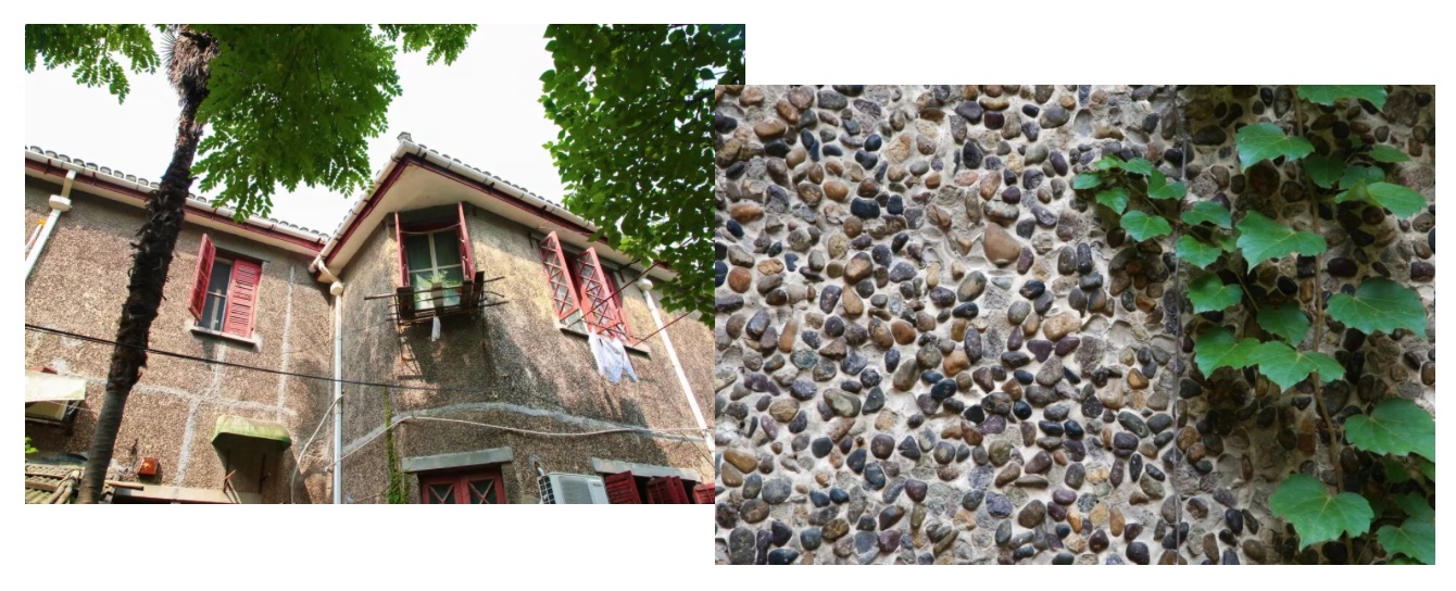 建筑外立面贴着小河卵石,外墙墙体中空,内层墙为板条抹灰隔墙,整个外墙隔热功能良好,住起来冬暖夏凉。
