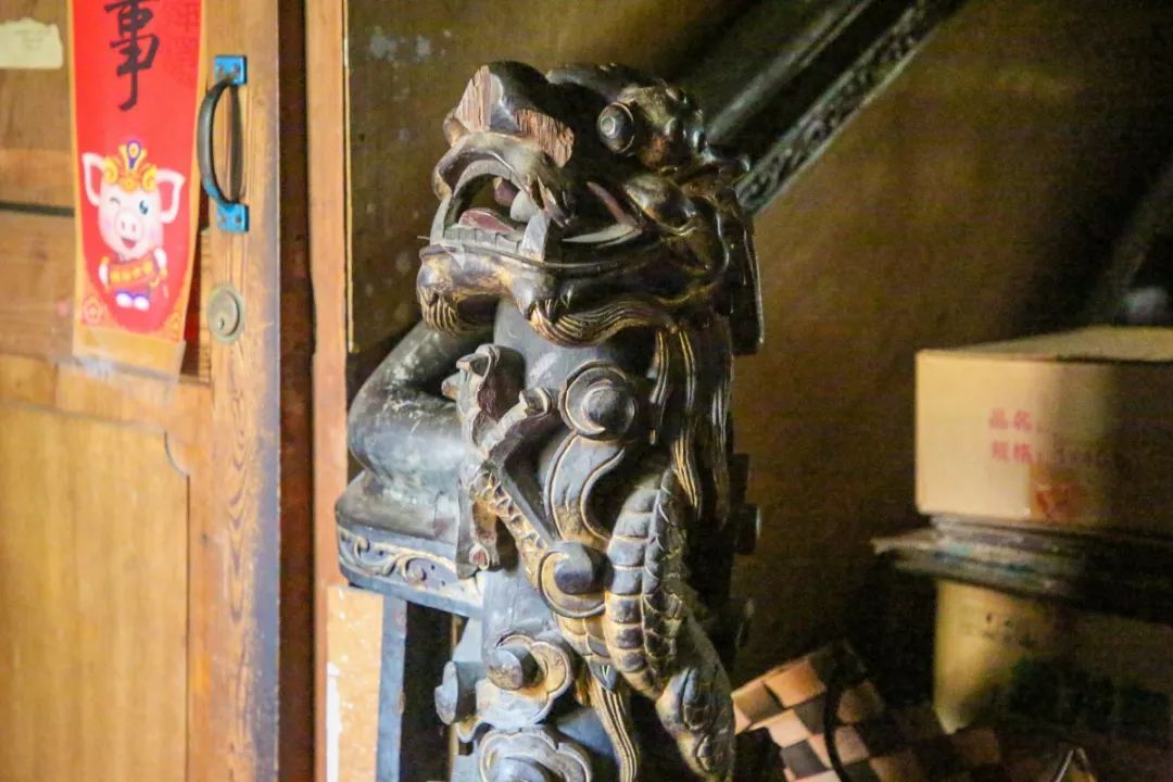 在厅堂迎门处原有李家老太太供奉的镏金弥勒佛坐像,约有六七十厘米大小,佛像底座下是镏金紫檀木浮雕二十四孝图。房屋大修拆除时还香气四溢。佛坛后面是檀木楼梯,四个转角立柱柱头都雕有狮头,口中含有一珠,柱身盘着龙神,全部镏金,至今仍可见到原貌。