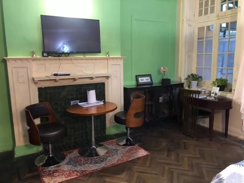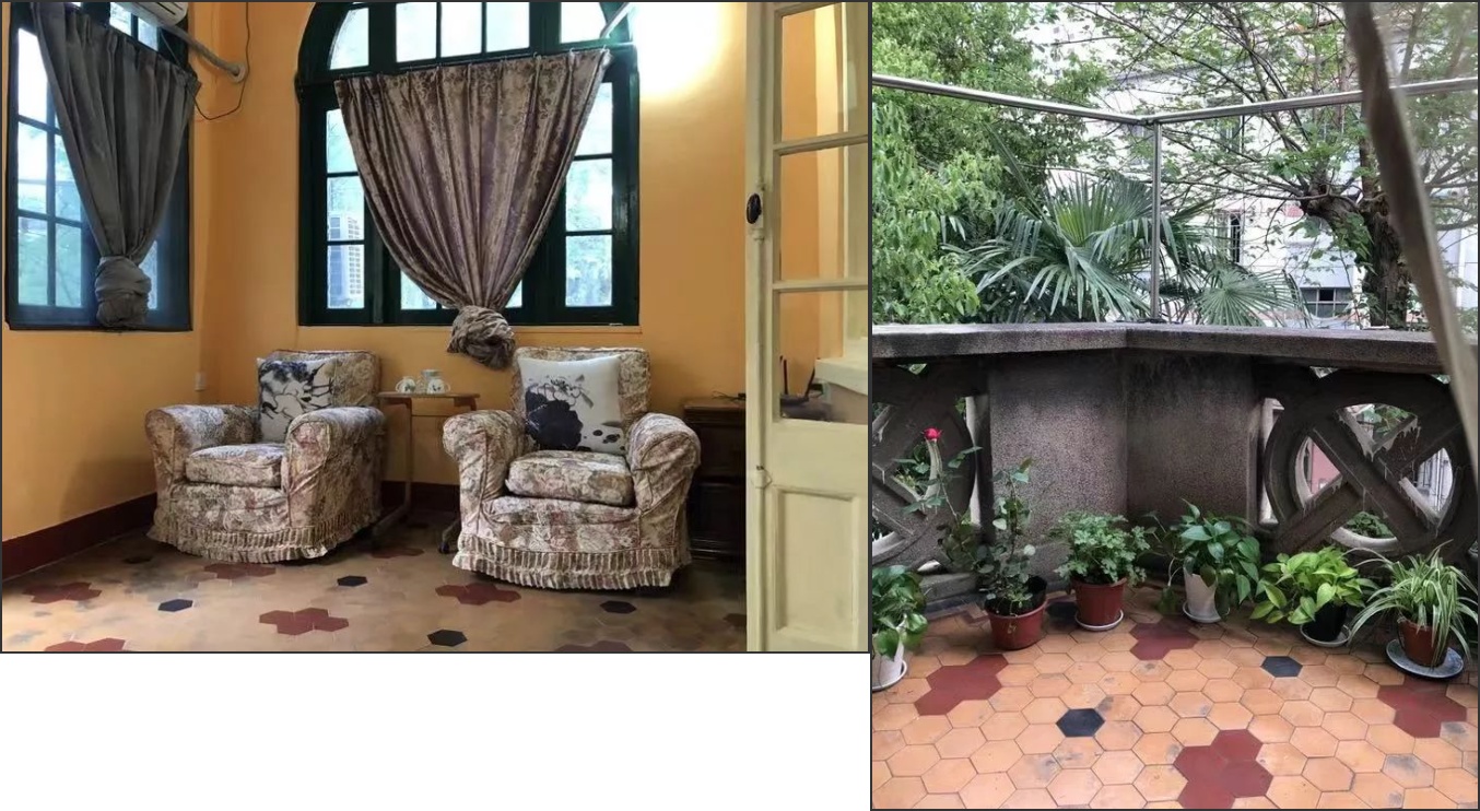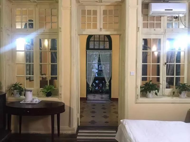 二楼的一家住户将房间改造成民宿,整体还原民国情调,乳白色的墙体、落地窗架带有欧洲中世纪风格,卧室可直通内阳台与外阳台,听屋主介绍,在过去,内阳台可作为会客、聚会之用,到了夏天,前后窗门打开,通风效果极佳。