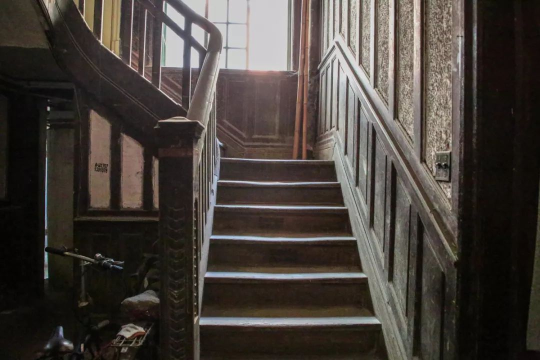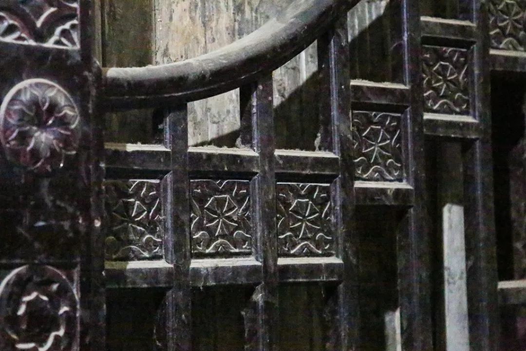 楼梯扶手和墙面都刻有带着古典特色的花纹图案,传统纹样成对相连,纹路仍十分清晰。